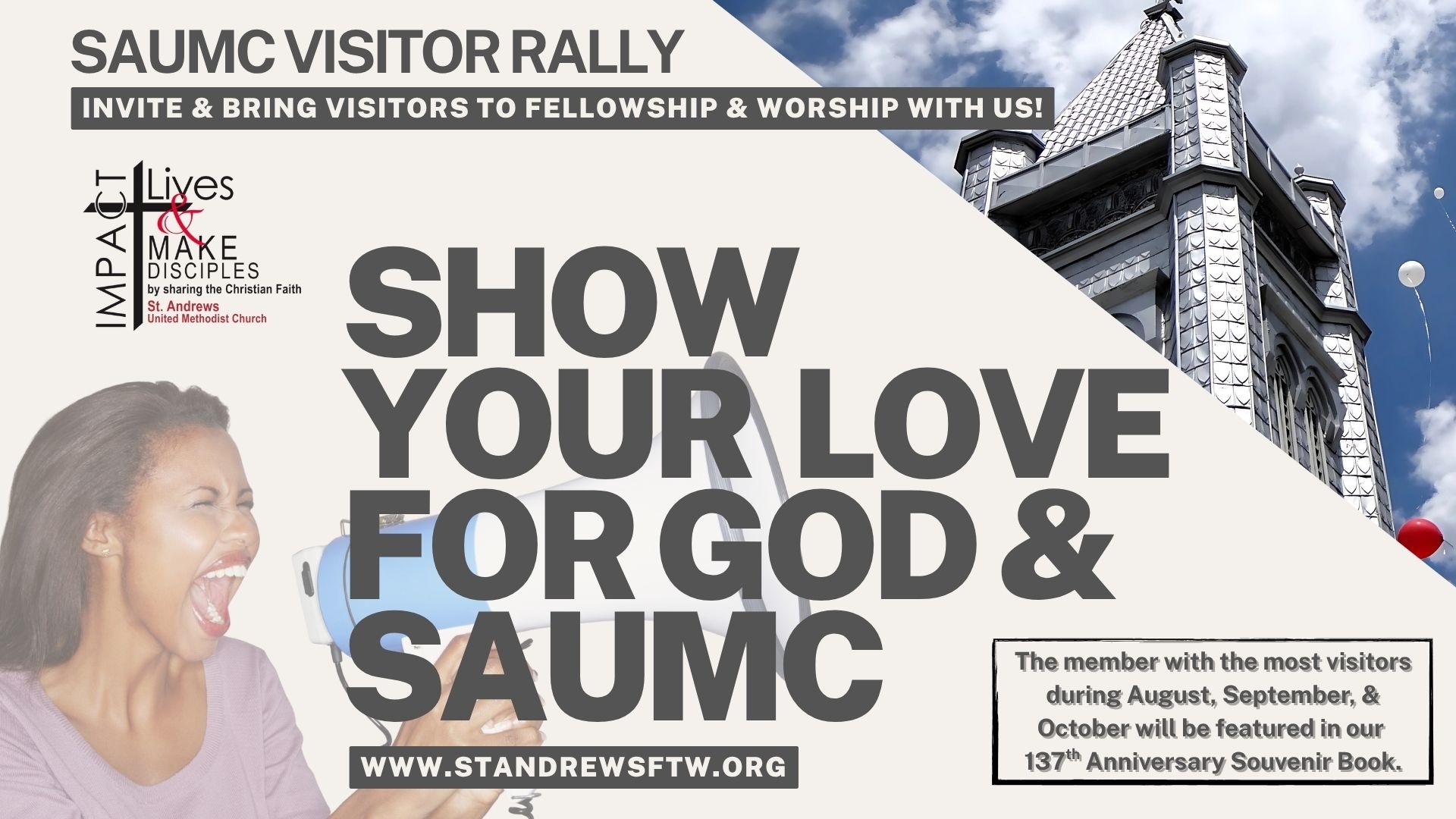 Visitor Rally! Come one, come all. Saint Andrews UMC invites you to show your love for God and the Church by inviting and bringing visitors to fellowship with us at all services, studies, activities, and events. The competitions will identify the member with the most visitors for the month. The member who invites the most during August, September, and October will be featured in the Anniversary Souvenir Book.