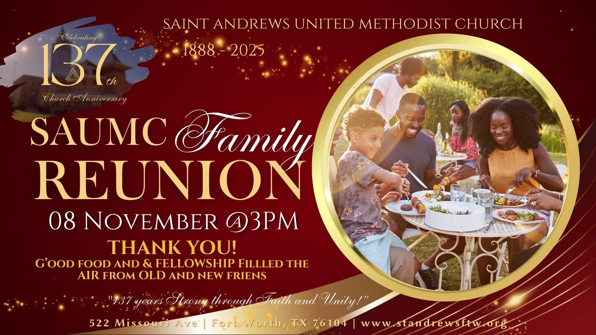 In celebration of Saint Andrews UMC 137th Church Anniversary "137 years strong through faith and unity!” "Behold, how good and how pleasant it is for brethren to dwell together in unity!" Psalm 133:1. Our next event will be our SAUMC Family Reunion, This Saturday, November 8th @ 3pm. Sponsored by the SAUMC 137th Anniversary Committee who will be cooking and serving. Free Fish Fry | Fellowship | Games.