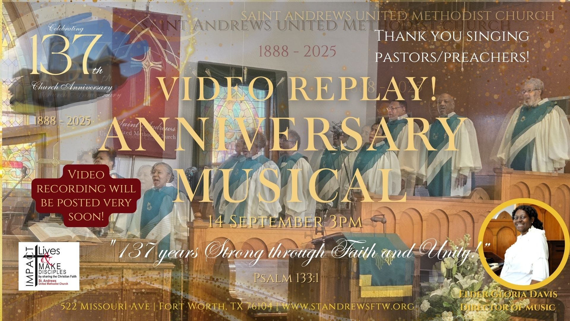 REPLAY VIDEO COMING SOON! The 137th Church Anniversary plans are under way. Mark your calendar for the following events: The Church Anniversary Annual Musical, Sunday, September 14 at 3:00 pm. Featured guest will be Singing Pastors/Preachers. Replay will be posted here.