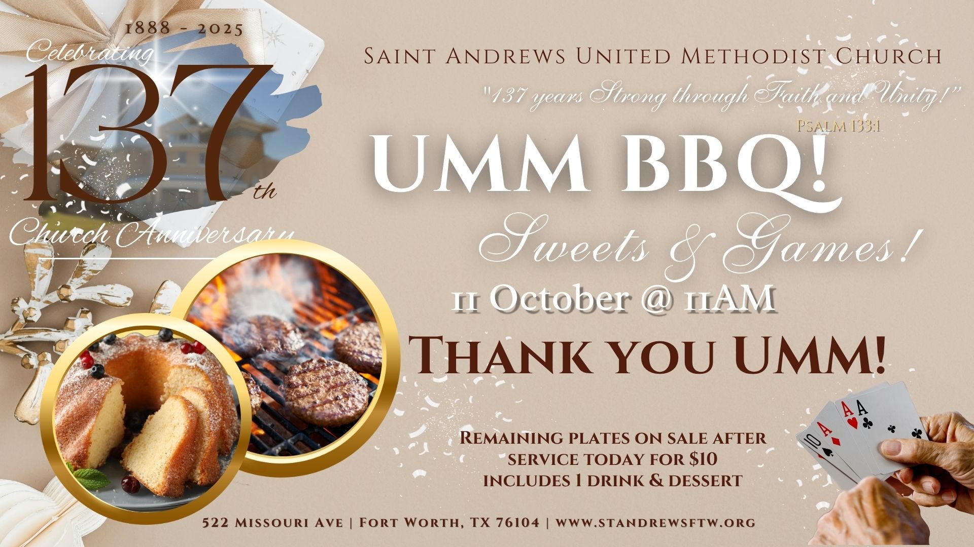 Thank you, United Methodist Men for sponsoring our Anniversary BBQ, Sweets and Games event yesterday! Community fellowshipped over all the good food. Extra plates with a drink and desert will be sold after church today for $10.