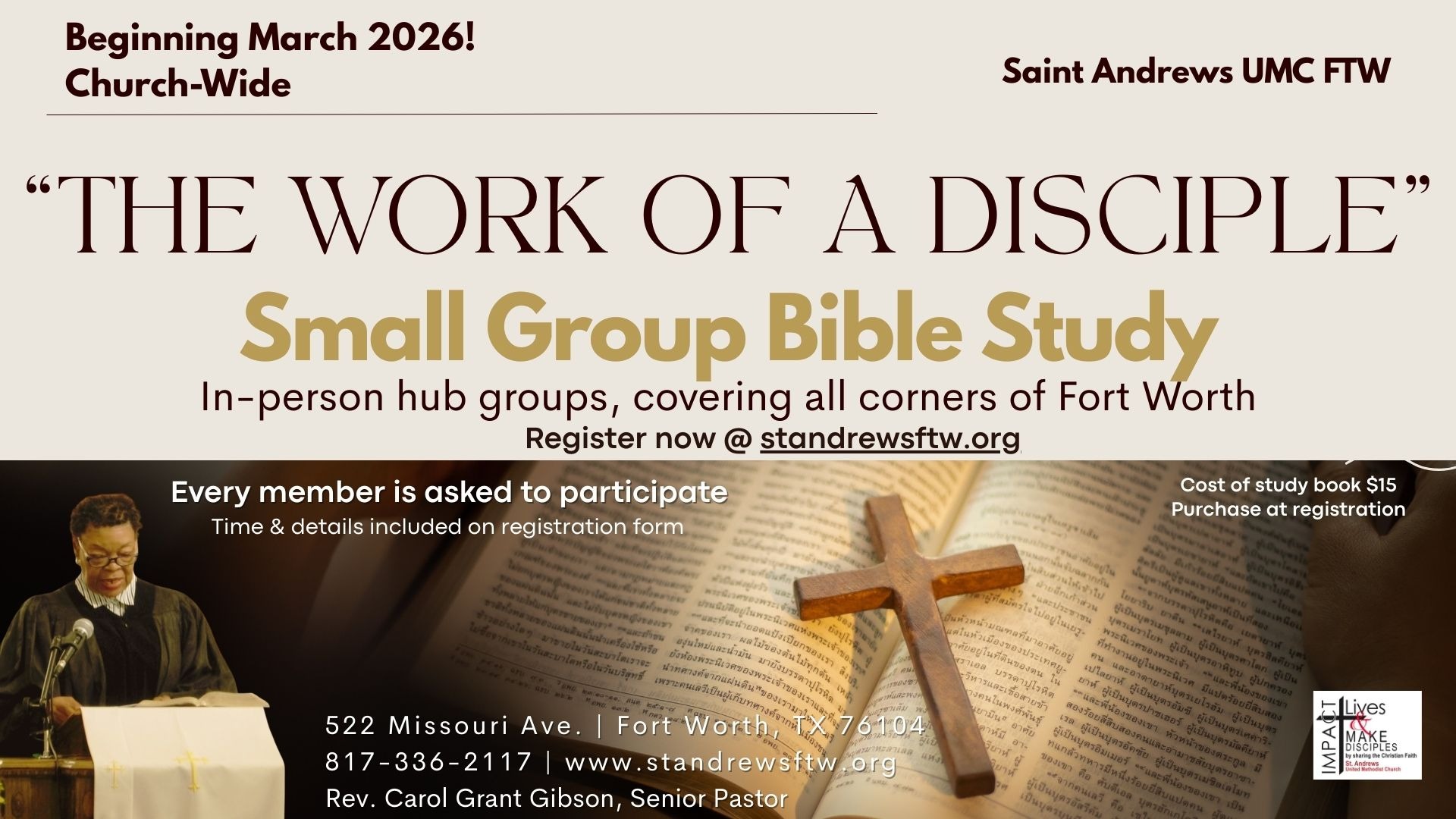 Church-Wide small group Bible Studies have returned and will begin in March. Meeting in person in different parts of Fort Worth. Our focus will be “The Work of a Disciple.” Registration will be available this week. Every member is asked to participate.