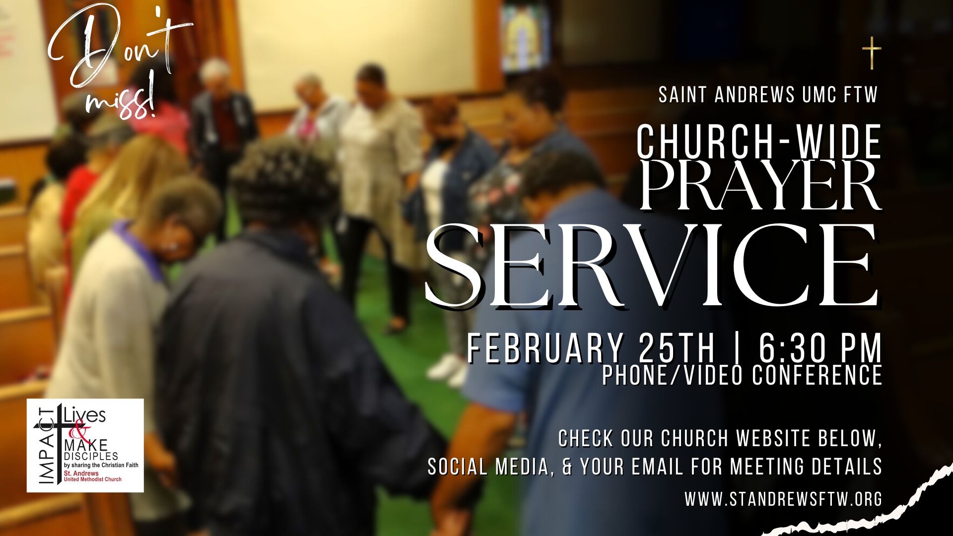 Church-Wide Prayer service has returned. 1 Thessalonians 5:17 tells us to pray without ceasing. Meet us on February 11th & 25th at 6:30 pm on phone/video conference to join together as one body to pray.