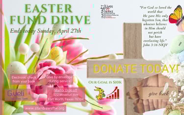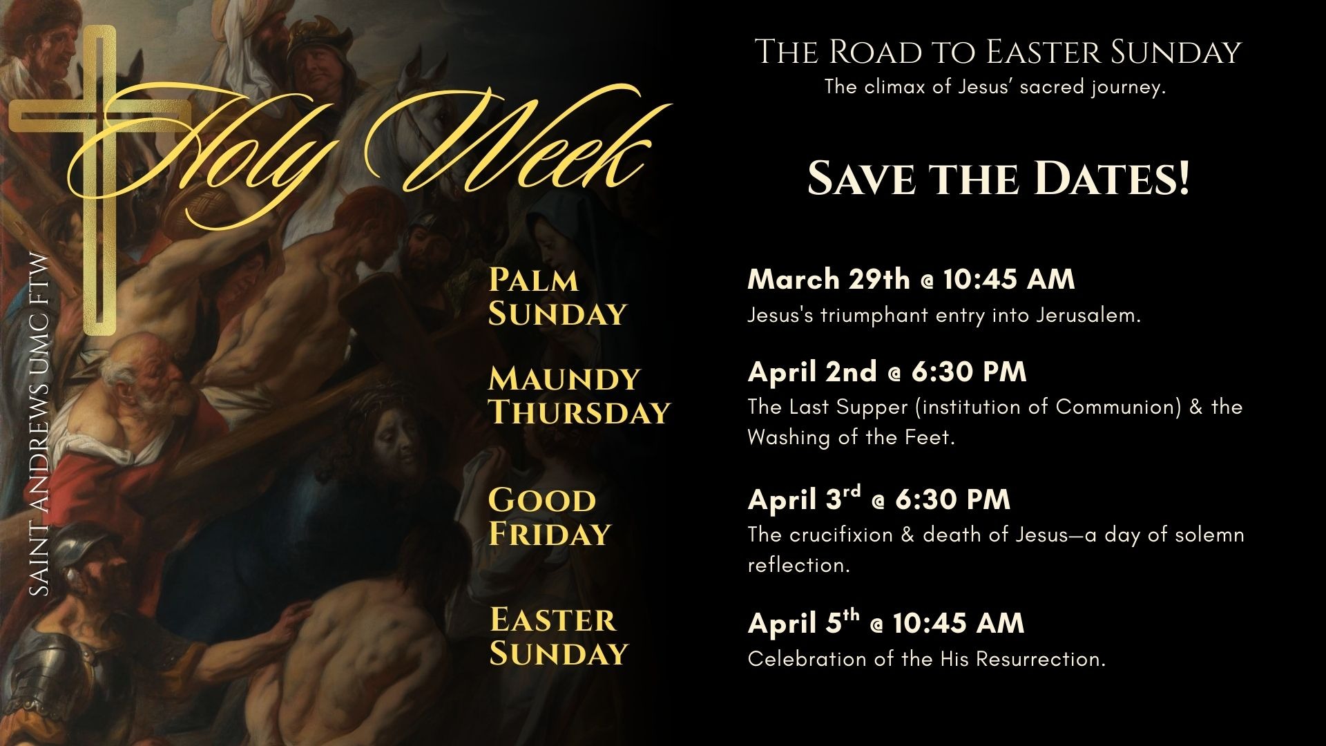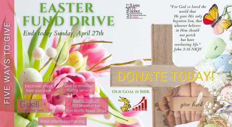 Easter is upon us! Holy Week will begin with Palm Sunday Worship service on Sunday, March 29th at 10:45 am followed by Maundy Thursday Service, April 2nd @6:30pm, Good Friday Service, April 3rd at 6:30 pm and culminate with Easter Sunday Resurrection Worship Service on April 5th at 10:45 am.