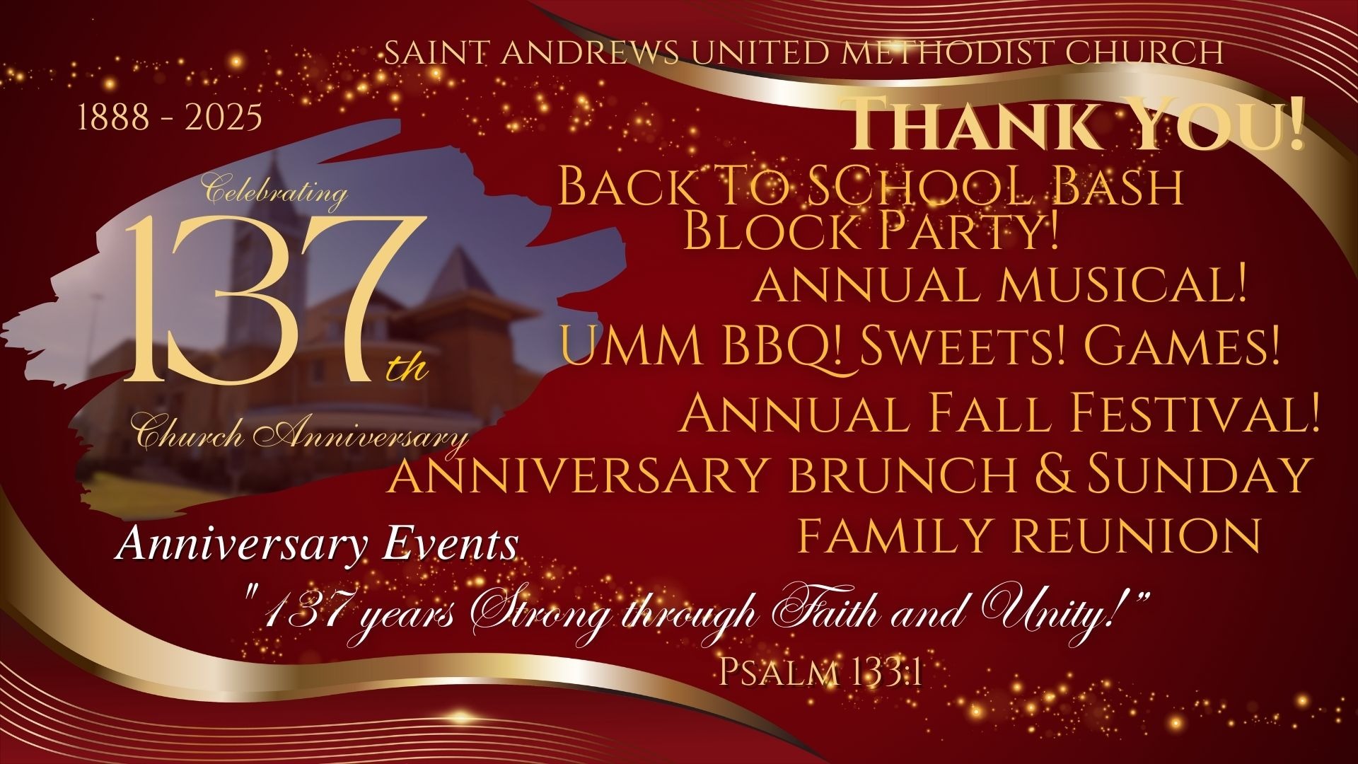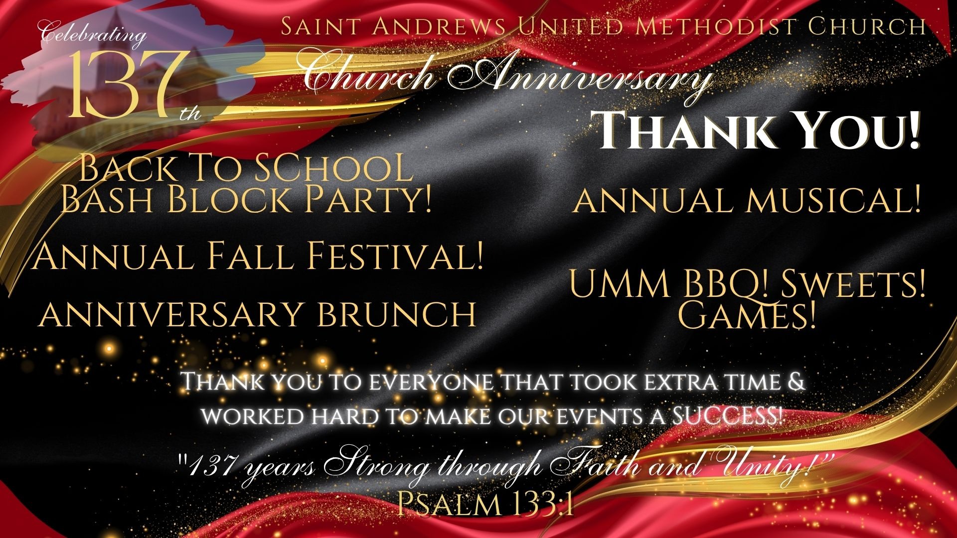 Saint Andrews UMC wishes to express our sincere thank you for your participation and support of our 137th Church Anniversary.