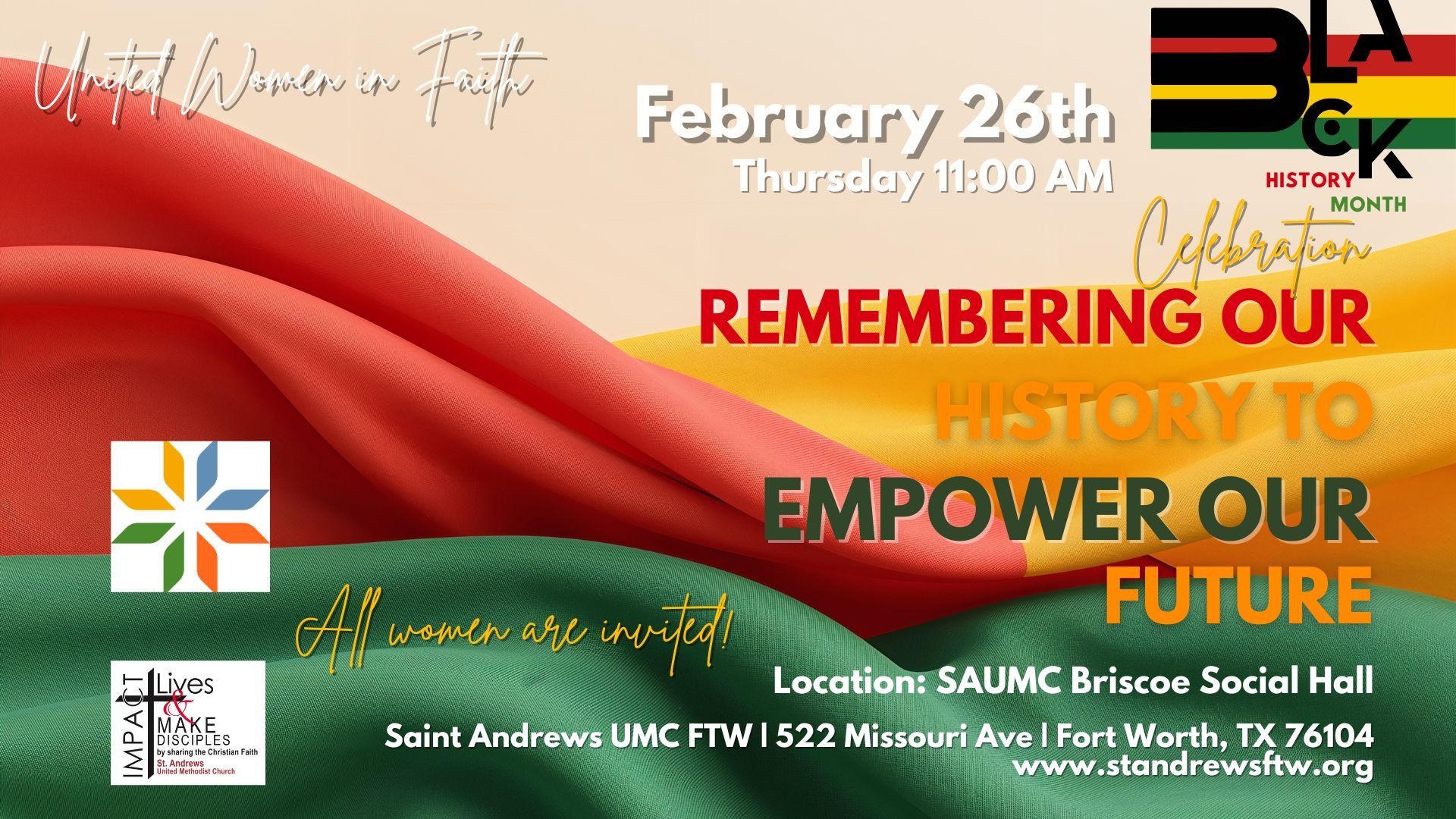 This Thursday at 11am, all women are invited join the United Women in Faith Black History celebration and monthly unit meeting here in the Briscoe Social Hall. The program will also include voting issues.