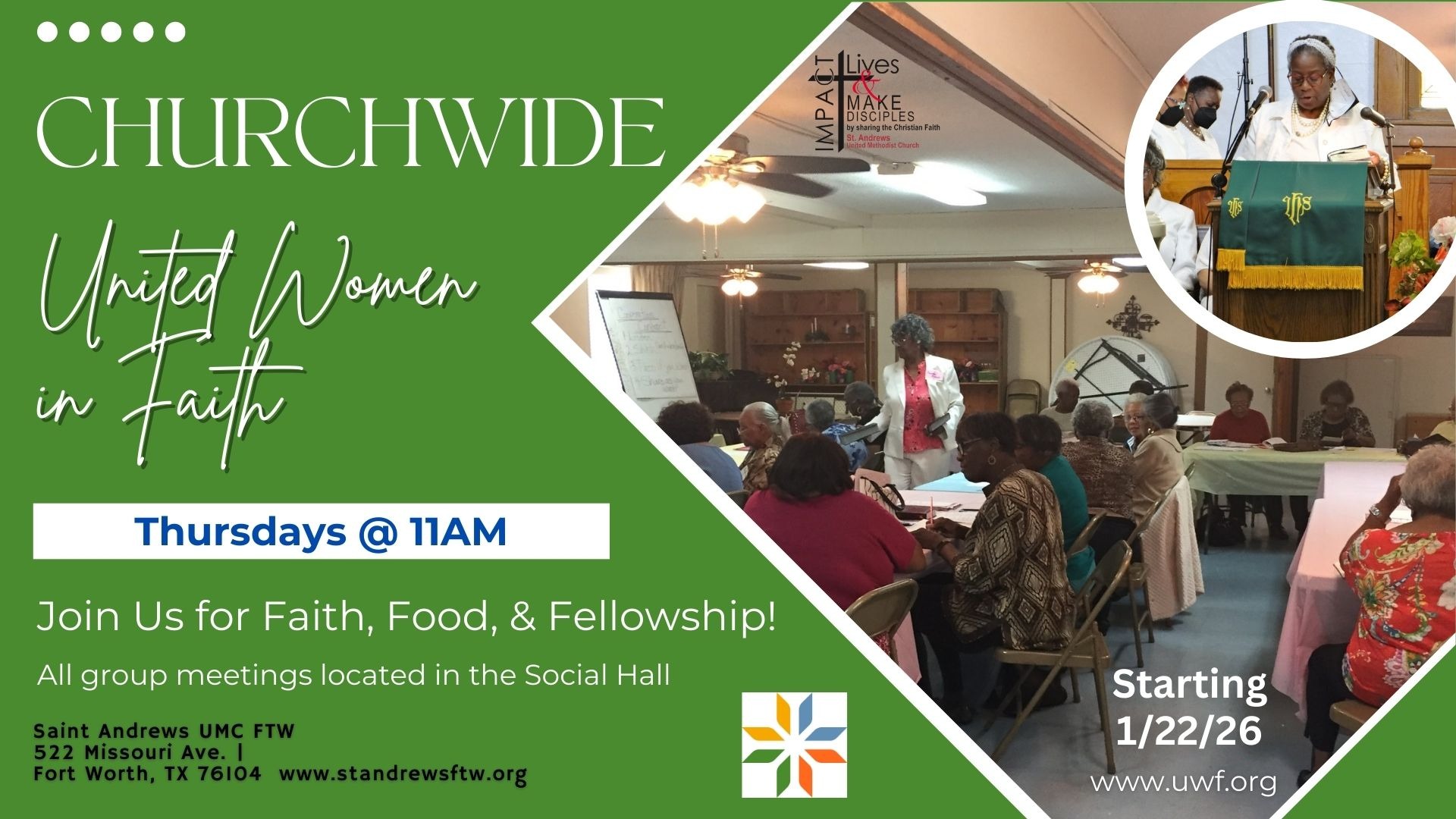 United Women in Faith will meet every 4th Thursday at 11:00 AM, starting January 22nd, in the Briscoe Social Hall. All are invited.